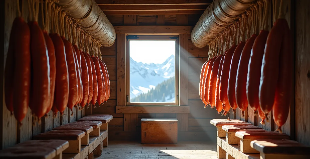 Vous flânez sur un marché de montagne, l’air est vif, les étals débordent de promesses gourmandes. Au milieu des fromages et des confitures, ils sont là : des chapelets de saucissons secs, emblèmes du terroir. Vous voulez rapporter un souvenir authentique, un vrai goût de vacances. Mais face à vous, le doute s’installe. Comment distinguer le fruit d’un savoir-faire ancestral d’une vulgaire copie industrielle venue de l’autre bout de l’Europe, simplement « maquillée » pour paraître locale ? Beaucoup pensent qu’un aspect rustique ou un prix attractif sont de bons indicateurs. C’est souvent l’inverse.