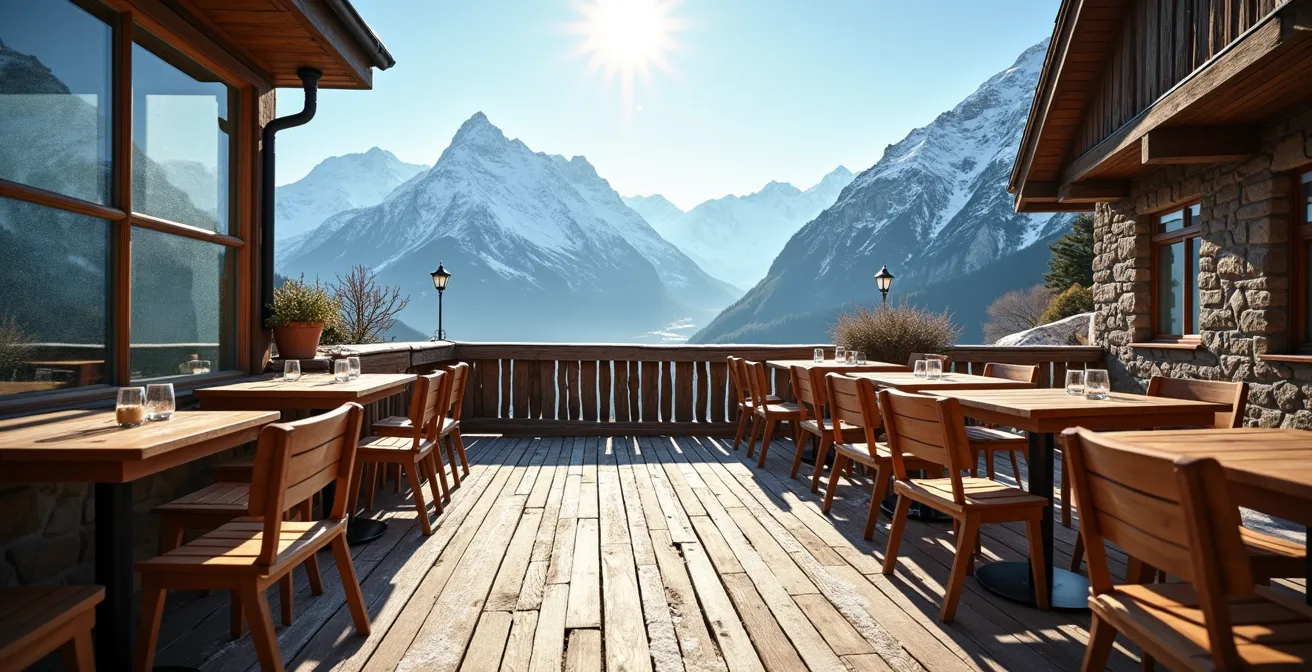 Certains établissements intelligents aménagent leurs terrasses en différentes zones d’exposition. Le cas du restaurant Le Panoramic à Tignes est exemplaire : sa vaste terrasse est conçue pour offrir des zones ensoleillées à différents moments de la journée. Les connaisseurs savent que la section ouest, délaissée le matin, devient le meilleur spot après 13h. Avant de choisir votre restaurant, prenez 30 secondes pour analyser sa position sur le plan des pistes et son orientation. Un restaurant niché dans une combe orientée nord-est n’aura jamais de soleil l’après-midi, même par grand beau temps.